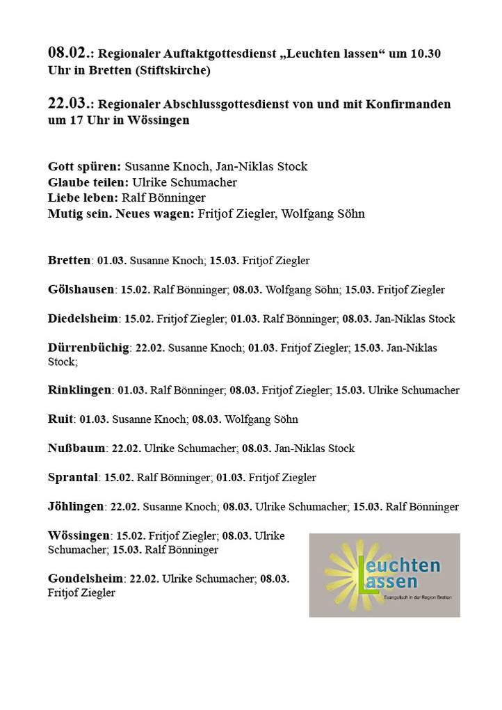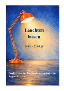 Mit dem Eröffnungsgottesdienst am 08. Februar startet unsere regionale Predigtreihe "Leuchten lassen". Die Predigtreihe greift das neue Leitmotiv unserer Region auf: „Leuchten lassen – Gott spüren, Glauben teilen, Liebe leben, Mutig sein. Neues wagen.“ Zu jedem dieser Motive wird es vom 15.02-22.03. über unsere Region verteilt Gottesdienste geben. Die Prediger*innen wandern mit ihrem Gottesdienst-Thema durch die Kirchen unserer Region. Eine gute Gelegenheit neue Impulse zu kriegen und sich inspirieren zu lassen. Den Abschluss werden unsere Konfis machen.